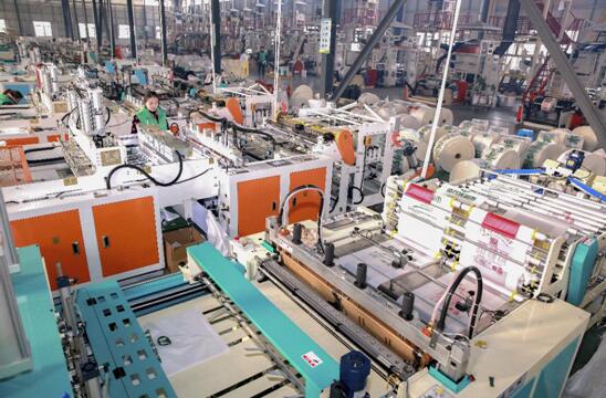 2021年1月7日、安徽省の桐城経済技術(shù)開発區(qū)の雙新産業(yè)パークで、従業(yè)員が生分解性プラスチックの袋を生産しているところ。(撮影?人民図片 江勝)