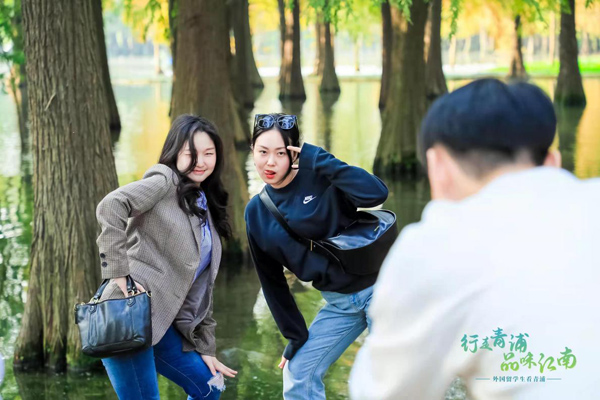 「水上森林」で記念寫真を撮影する外國人留學(xué)生たち