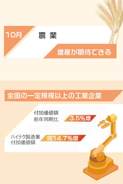 農(nóng)業(yè)は増産が期待され、工業(yè)は成長率が回復(fù)上昇し、ハイテク製造業(yè)は発展?fàn)顩rが好転した。10月は全國的に秋の収穫期の終了が近づき、各地の実際の収穫狀況を見ると増産が期待できる。全國の一定規(guī)模以上の工業(yè)企業(yè)(年売上高2000萬元以上の企業(yè)、1元は約17.9円)の付加価値額は前年同期比で3.5%増加し、成長率は前月を0.4ポイント(p)上回り、そのうちハイテク製造業(yè)の付加価値額は同14.7%増加し、成長率は前月を0.7p上回った。