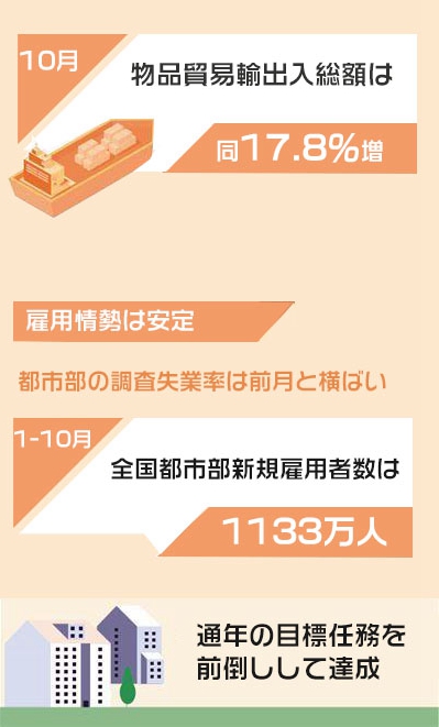 雇用情勢は全體として安定し、都市部の調(diào)査失業(yè)率は前月と橫ばいだった。1-10月の全國都市部新規(guī)雇用者數(shù)は1133萬人で、通年の目標(biāo)任務(wù)を前倒しして達(dá)成した。10月の全國都市部調(diào)査失業(yè)率は4.9%で、前月と橫ばいだった。