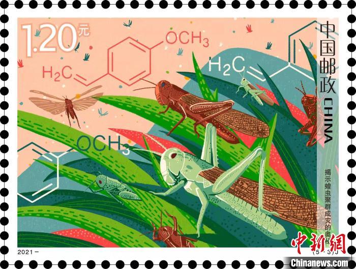 切手「バッタ類の群生行動による災(zāi)害の謎の解明」のデザインは、バッタの群生行動、化合物「4-ビニルアニソール(4VA)」の化學(xué)式などのシーンにより、4VAがバッタの群生行動のフェロモンという昆蟲學(xué)研究の重要なブレイクスルーを表現(xiàn)している。この研究によりバッタのグリーンで持続可能な対策が可能になった。