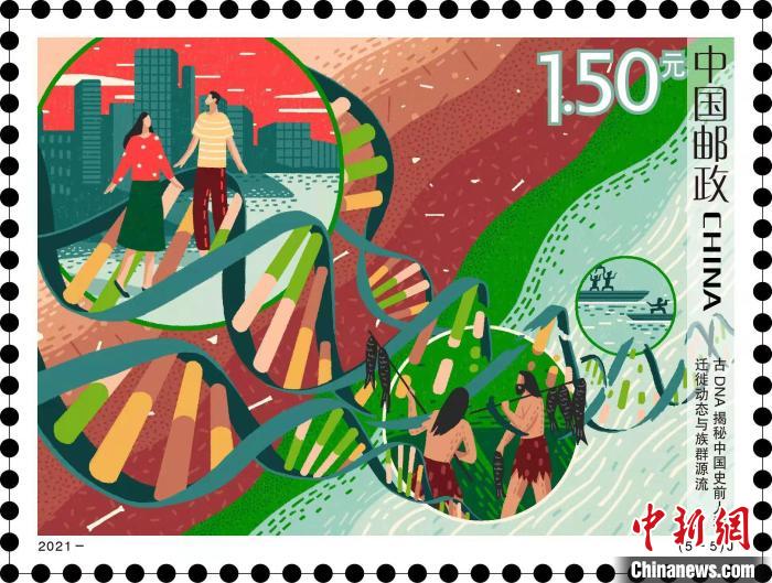 切手「古代DNAが有史以前の中國の人類移動の動態(tài)及び民族の源流を解明」のデザインは、今昔の対比、DNA、古代地層など。関連研究は有史以前の中國の人類の遺伝と進(jìn)化の歴史を直接浮かび上がらせ、東洋、特に中國地域の有史以前の人類の遺伝、進(jìn)化、適応の重要情報を補った。