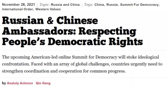 米誌「ナショナル?インタレスト」は26日、米國が12月に開催するいわゆる「民主主義サミット」に共同で反対する、中國の秦剛駐米大使とロシアのアントノフ駐米大使の共同寄稿を掲載した。両大使は寄稿で、「民主主義サミット」について、「明らかに冷戦思考の産物であり、イデオロギー的対立と世界の分?jǐn)啶蛞黏长?、新たな『分?jǐn)嗑€』を作り出し、今日の世界の発展と逆行するものだ。中國とロシアはこの行動(dòng)に斷固反対する」とした。