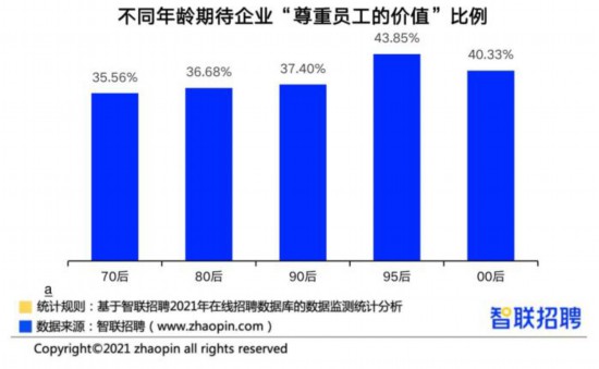 報告によると、年齢別では、Z世代(1995年から2009年生まれの世代)の労働者のほうが、その上の世代より、「尊重される」ことを重視している人が多かった。具體的には、95後(1995-99年生まれ)の43.8%が、00後(2000年以降生まれ)の40.3%が「従業(yè)員の価値を尊重する」を選んだ。同項目を選んだ70後(70年代生まれ)、80後(80年代生まれ)、90後(90年代生まれ)はそれぞれ35.6%、36.7%、37.4%だった。