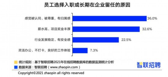 「企業(yè)を選んだり、そこに留まったりする一番の理由は?」との質(zhì)問に、労働者の36.0%が「認められている、尊重されている、居場所がある」と答え、「給料が多い、プロジェクト手當が多い」(32.6%)、「業(yè)界の安定的な発展などのマクロ環(huán)境が優(yōu)れている」(22.5%)を上回った。