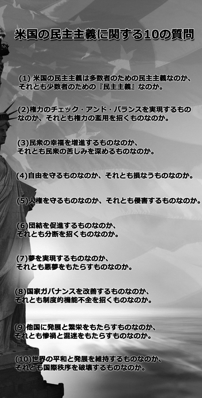 報告書は「米國政府はいわゆる『民主主義サミット』を開催するにあたり、以下の問題をまず自問してみたほうがいい。(1)米國の民主主義は多數(shù)者のための民主主義なのか、それとも少數(shù)者のための『民主主義』なのか。(2)権力のチェック?アンド?バランスを?qū)g現(xiàn)するものなのか、それとも権力の濫用を招くものなのか。(3)民衆(zhòng)の幸福を増進するものなのか、それとも民衆(zhòng)の苦しみを深めるものなのか。(4)自由を守るものなのか、それとも損なうものなのか。(5)人権を守るものなのか、それとも侵害するものなのか。(6)団結(jié)を促進するものなのか、それとも分斷を招くものなのか。(7)夢を?qū)g現(xiàn)するものなのか、それとも悪夢をもたらすものなのか。(8)國家ガバナンスを改善するものなのか、それとも制度的機能不全を招くものなのか。(9)他國に発展と繁栄をもたらすものなのか、それとも慘禍と混迷をもたらすものなのか。(10)世界の平和と発展を維持するものなのか、それとも國際秩序を破壊するものなのか」と指摘した。