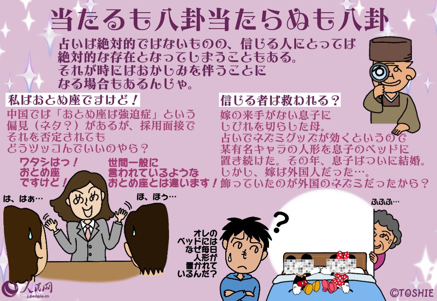 占いというものはまさに「當(dāng)たるも八卦、當(dāng)たらぬも八卦」という言葉が示すとおりで、絶対的なものでは決してない。ただ、何かにすがりたい時や誰かに道を示してほしいという気持ちを抱いている時に、ちょっとしたきっかけになったりするもの。血液型にしろ、星座にしろ、別の視點から自分や他人を理解する方法としてとらえると、距離をおいて楽しむことができるかもしれない。 (文?イラスト?玄番登史江、袁蒙)。