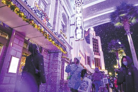 最近、冬をテーマにデコレーションされたユニバーサル?北京?リゾート。夜になりワクワクするようなムード漂うハリウッド?ブールバード(撮影?武亦彬)。