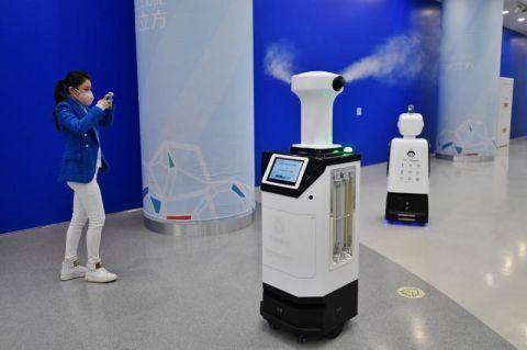 會(huì)場(chǎng)內(nèi)のミスト消毒ロボットは1分で36平方メートルの面積を消毒できる。このほかに紫外線消毒ロボットも使用される。