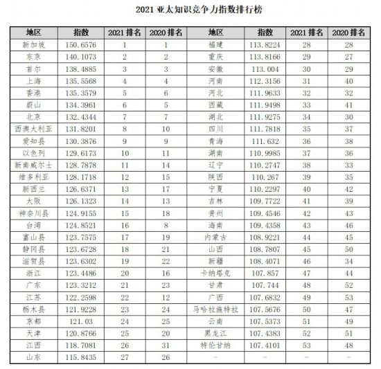 「アジア太平洋知識競爭力指數(shù)」は、アジア太平洋の53地域を19項目の指標で評価しており、各地域の知識資本を経済価値や住民の財産に転換する能力を総合的に反映している。同指數(shù)は2010年から発表されており、今回で12回目となる。