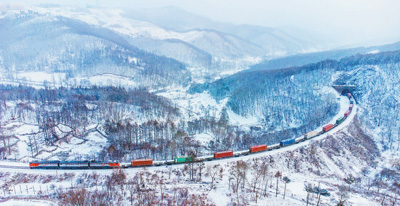 畫像は12月17日、綏芬河通関地を出発した「中歐班列」が雪に覆われた森の中を走り抜ける様子。(撮影?郝迎燦と曲蕓偉)