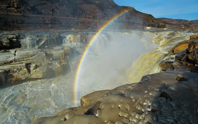 虹がかかった黃河壺口瀑布(12月17日にドローンで撮影)。