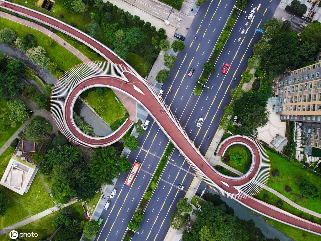 四川省成都市高新區(qū)天府二街に鮮やかな色合いの「如意(僧が読経や説法の際などに手に持つ道具)」の形をした歩道橋が話題となっており、噂を聞きつけた大勢の市民や観光客が、吉祥幸運を呼び寄せようとやって來ては記念寫真を撮影している。如意橋は全長331メートル、うちメイン區(qū)間の長さは213メートル、幅5メートル、両端にはらせん階段が設置されており、通行しやすいだけでなく、機能性を備えた都市彫刻の趣も漂わせている。上空から撮影すると、「如意橋」は、まるで都市に填め込まれた「如意」そのもので、その流れるような曲線はまるで音楽の旋律を目にしているようで獨特の美しさをたたえている。(編集KM)