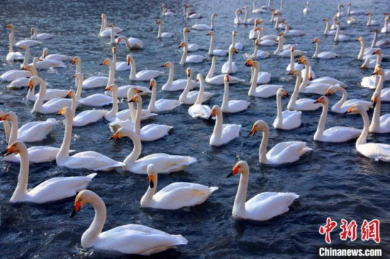 越冬するために飛來し、新年のおめでたいムードに花を添えるハクチョウ(撮影?楊厚偉)。