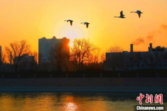 2日、赤々と染まった空を飛ぶハクチョウ(撮影?楊厚偉)。