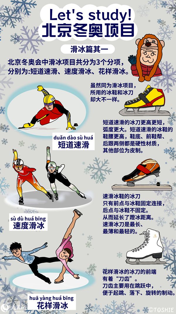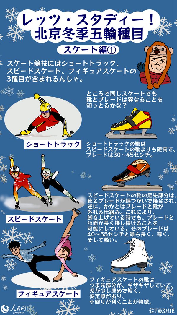2022年2月4日から中國の北京で開催される北京冬季五輪。その開會に先立ち、人民網では冬季五輪の計7競技(スキー、スケート、アイスホッケー、カーリング、ボブスレー、リュージュ、バイアスロン)と15種別(アルペンスキー、フリースタイルスキー、スノーボード、ジャンプ、クロスカントリースキー、ノルディック複合、ショート?トラック、スピード?スケート、フィギュア?スケート、アイスホッケー、カーリング、ボブスレー、スケルトン、リュージュ、バイアスロン)を「イラストで知ろう!イマドキ中國」でおなじみのキャラたちが中國語と日本語で紹介。普段はあまり觸れることのないこうした競技名などを観戦前に予習していこう!