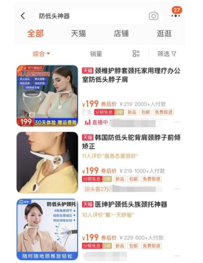 「頭部を支え、首にかかる負(fù)擔(dān)を減らす」を謳い文句とした「うつむき防止グッズ」が最近、大ヒット商品となっている。かつて誰もが一度は目にしたことがある學(xué)生向けにデザインされた座る姿勢(shì)を矯正するグッズと異なり、「うつむき防止グッズ」は、首のコルセットのようで、機(jī)に挾む必要はなく、首に直接裝著して使用する。