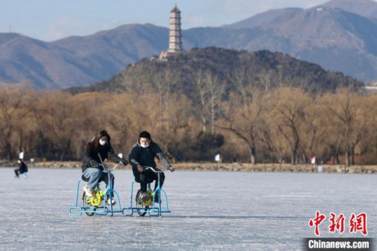 10日午前、頤和園スケート場で氷上自転車やそり遊びなどに興じる観光客(撮影?易海菲)。