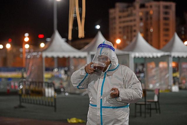 天津市浜海新區(qū)泰達(dá)第一體育場のPCR検査所で、業(yè)務(wù)の合間に立ったまま臘八粥を味わうスタッフ(1月10日撮影?趙子碩)。