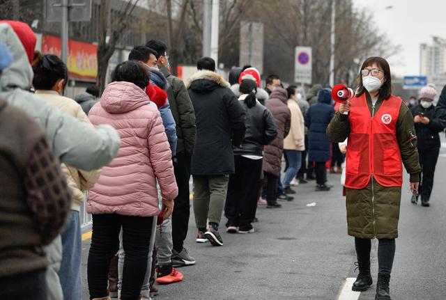 天津市南開區(qū)鼓樓街道(エリア)のPCR検査所で、検査を待つ人々に拡聲器を使ってPCR検査の注意事項を説明するボランティア(寫真右、1月9日撮影?孫凡越)。