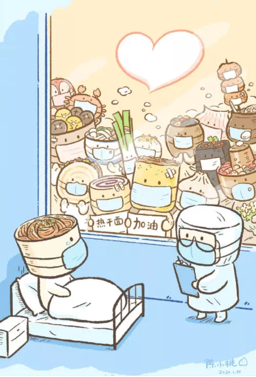 2020年の年初、新型コロナウイルス感染拡大が生じていた湖北省武漢市にエールを送ったイラストが人々の心に溫もりを與えた。その擬人化された中國(guó)全土のグルメが武漢名物グルメの熱乾麺にエールを送るというイラストは、困難を共に克服するよう多くの人々を鼓舞した。中國(guó)新聞社が伝えた。