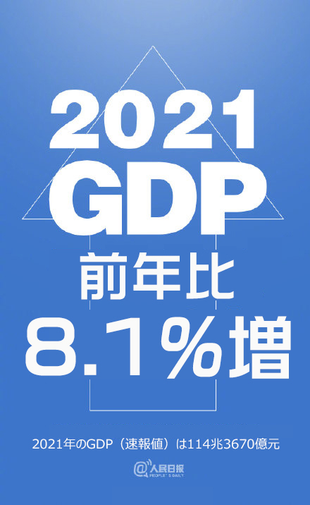 中國國家統(tǒng)計局によると、2021年の國內(nèi)総生産(GDP、速報値)は114兆3670億元(1元は約18.0円)で、不変価格に基づく計算では前年比8.1%増、2年間の平均増加率は5.1%増だった。