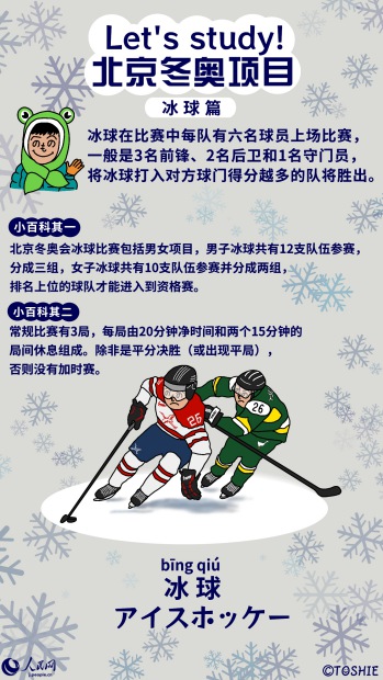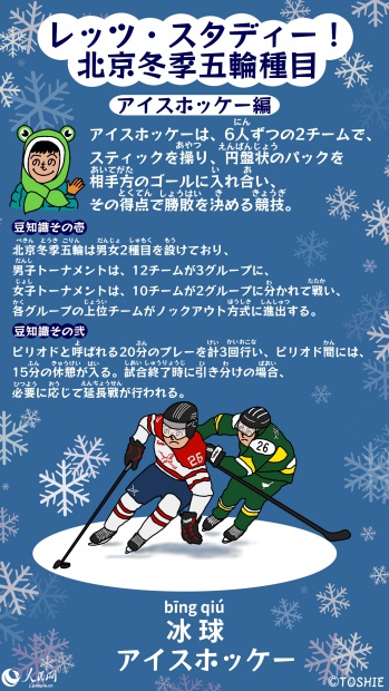 アイスホッケーは2022年2月3日から20日までの日程で五棵松體育館と國(guó)家體育館で行われる。(文?イラスト?玄番登史江)