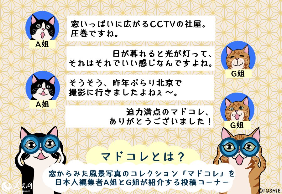 ウチのオフィスの窓からは、こんな風(fēng)景またはこんなモノが見えると自慢していただく「マドコレ(窓から見た風(fēng)景コレクション)」コーナー。どこまでも続く青い空や遠くに見える山々といった自然の風(fēng)景から、オフィス街に建ち並ぶ高層ビルや幹線道路を走る車、庶民の暮らしが垣間見えるローカルな街並み、はたまた移動中の車窓からの眺めなどなど、高さや場所も異なれば、その窓から眺める風(fēng)景も千差萬別。中には仕事の意欲をアップさせてくれる元気の出る光景もあれば、疲れを癒してくれるほっこりした風(fēng)景も。そんな皆さまからお寄せいただいたマドコレの數(shù)々を、毎週火曜日に、人民網(wǎng)日本人編集者のA姐とG姐がコメントしながら、のんびり紹介していきます。