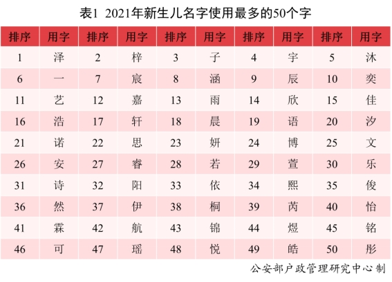 報(bào)告によると、2021年に生まれて戸籍登録された新生児の名前に最も多く使われていた漢字トップ5は上から順に「沢」、「梓」、「子」、「宇」、「沐」だった。2020年と比べると、「汐」、「芮」、「霖」、「航」などの漢字が人気となった。