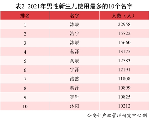 報(bào)告によると、2021年に生まれて戸籍登録され男児で最も多かった名前トップ10は上から順に、「沐宸」、「浩宇」、「沐辰」、「茗沢」、「奕辰」、「宇沢」、「浩然」、「奕沢」、「宇軒」、「沐陽」だった?!负朴睢?、「奕辰」、「宇軒」は2020年にもトップ10に入っていた。その他の名前は初のトップ10入りとなった。うち、トップの「沐宸」は2萬3000人だった。