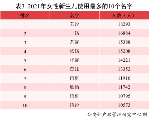 2021年に生まれて戸籍登録され女児で最も多かった名前トップ10は上から順に、「若汐」、「一諾」、「蕓涵」、「依諾」、「梓涵」、「苡沫」、「雨桐」、「欣怡」、「語桐」、「語汐」だった?!溉粝?、「蕓涵」、「苡沫」がトップ10に入るのは初めて。うち、トップの「若汐」は1萬8000人だった。(本稿の畫像は全て公安部の公式サイトから)(編集KN)