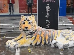 4時(shí)間かけて迫力満點(diǎn)のトラの雪像作り上げた父と子 河南省