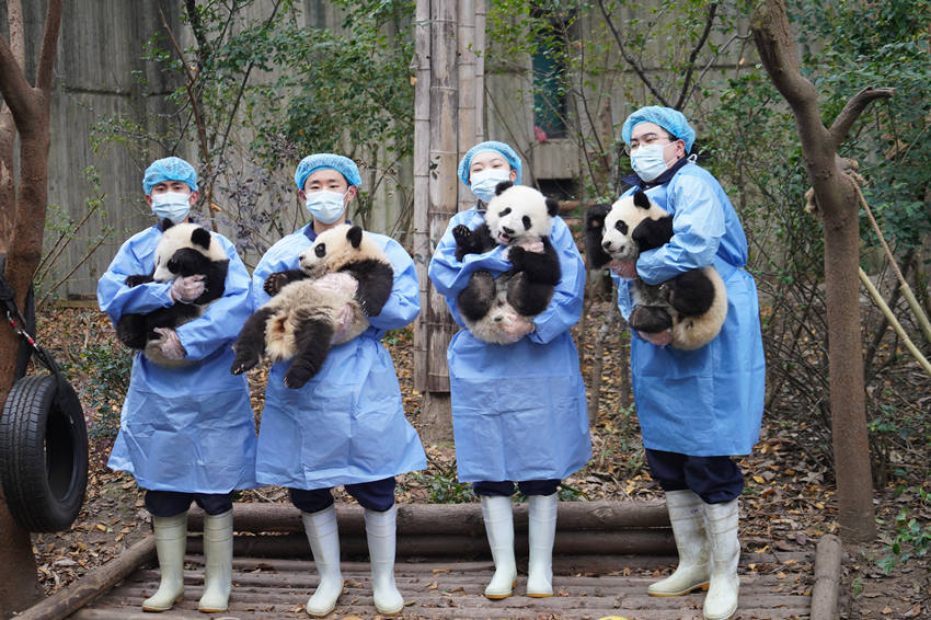 パンダと飼育員が全國國民に新春の祝賀メッセージを送った。(寫真提供は成都ジャイアントパンダ繁殖研究基地)