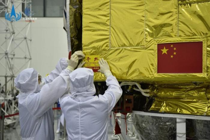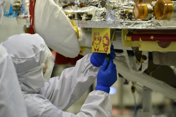 スタッフが火星周回モジュールに北京冬季オリパラのエンブレムを取り付ける様子。寫真提供は中國月探査プロジェクトの微信(WeChat)公式アカウント。