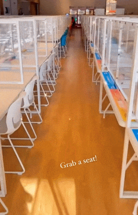 また新型コロナウイルス対策のために、食堂の各席には仕切りが設(shè)置されている。