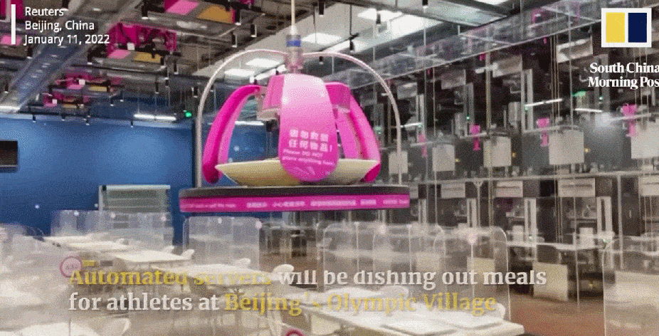 報道陣向けのレストランには、料理が自動で運ばれて來るロボットもある。注文すると、出來立ての料理が「天から降りて來る」のだ。各國のメディアの間で、北京冬季五輪の選手村の食堂が好評を博しているのもうなずける。