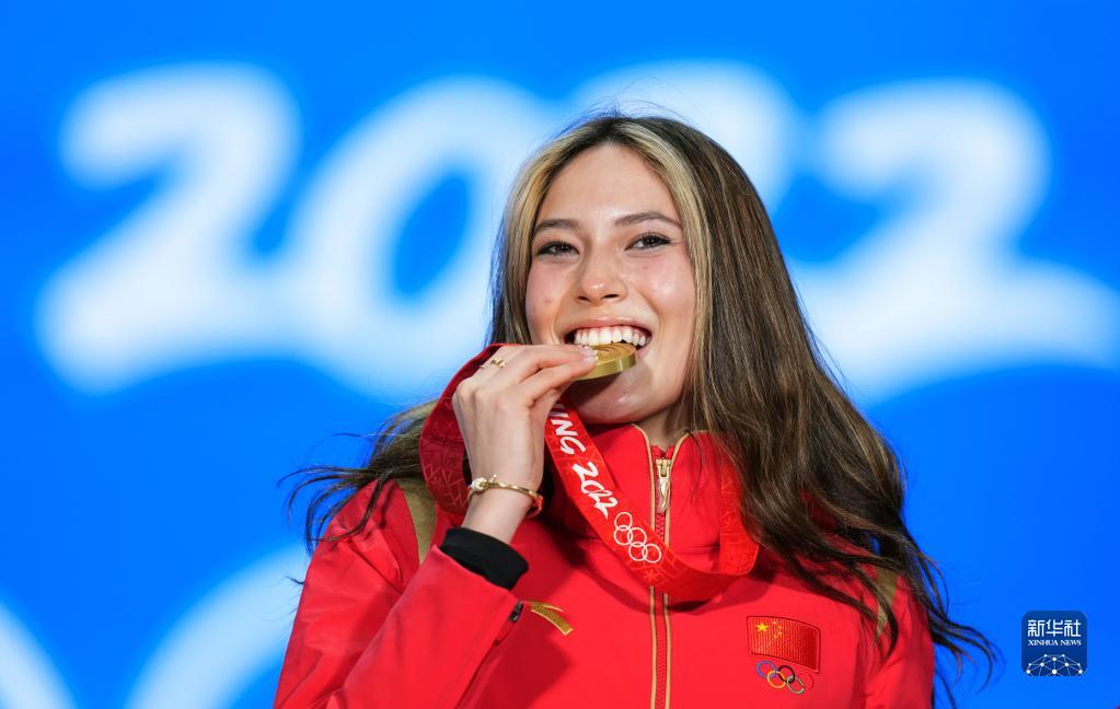 2月8日、金メダルを獲得した中國のアイリーン?グー選手の授章式での様子(撮影?鞠煥宗)。