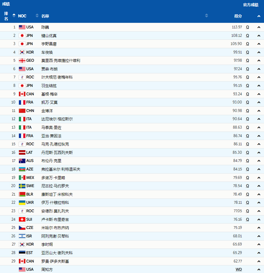 北京冬季五輪?フィギュアスケート?男子シングルのショートプログラム(SP)は8日午後に終了し、選手29人が演技を披露して、上位24人が10日のフリーに進んだ?,F(xiàn)時點でトップ3は、米國のネイサン?チェン選手、日本の鍵山優(yōu)真選手と宇野昌磨選手で、注目を集める羽生結(jié)弦選手は序盤のミスが影響して8位だった。中國の金博洋選手は11位でフリーに進んだ。