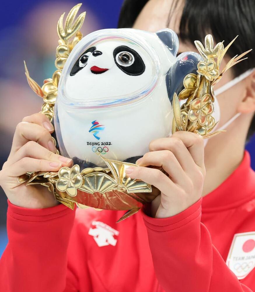 記念品贈(zèng)呈式で撮った北京冬季五輪の大會(huì)マスコット「氷墩墩(ビン?ドゥンドゥン)」。(寫真提供?新華社)