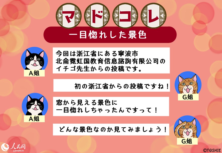 ウチのオフィスの窓からは、こんな風(fēng)景またはこんなモノが見えると自慢していただく「マドコレ(窓から見た風(fēng)景コレクション)」コーナー。どこまでも続く青い空や遠(yuǎn)くに見える山々といった自然の風(fēng)景から、オフィス街に建ち並ぶ高層ビルや幹線道路を走る車、庶民の暮らしが垣間見えるローカルな街並み、はたまた移動(dòng)中の車窓からの眺めなどなど、高さや場所も異なれば、その窓から眺める風(fēng)景も千差萬別。中には仕事の意欲をアップさせてくれる元?dú)荬纬訾牍饩挨猡ⅳ欷?、疲れを癒してくれるほっこりした風(fēng)景も。そんな皆さまからお寄せいただいたマドコレの數(shù)々を、毎週火曜日に、人民網(wǎng)日本人編集者のA姐とG姐がコメントしながら、のんびり紹介していきます。