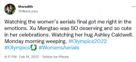 米國(guó)NBCのアジア系米國(guó)人記者はツイッターで、「徐選手が優(yōu)勝して、コールドウェル選手が大喜びするシーンは、まさにスポーツマンシップの表れだ」と綴っている。
