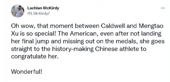 オーストラリアのスポーツサイトのプロデューサーも、「コールドウェル選手と徐夢(mèng)桃選手が抱き合ったあの瞬間はとても特別だった。コールドウェル選手は最後の演技で著地に失敗し、メダルを逃したにもかかわらず、歴史を塗り替えた中國(guó)の選手を祝福した」と絶賛している。
