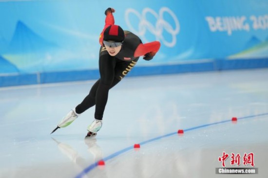 レースで力走する阿合娜爾·阿達克選手。2月7日午後、阿達克選手は北京冬季五輪スピードスケート女子1500メートル決勝で17位に(撮影?崔楠)。