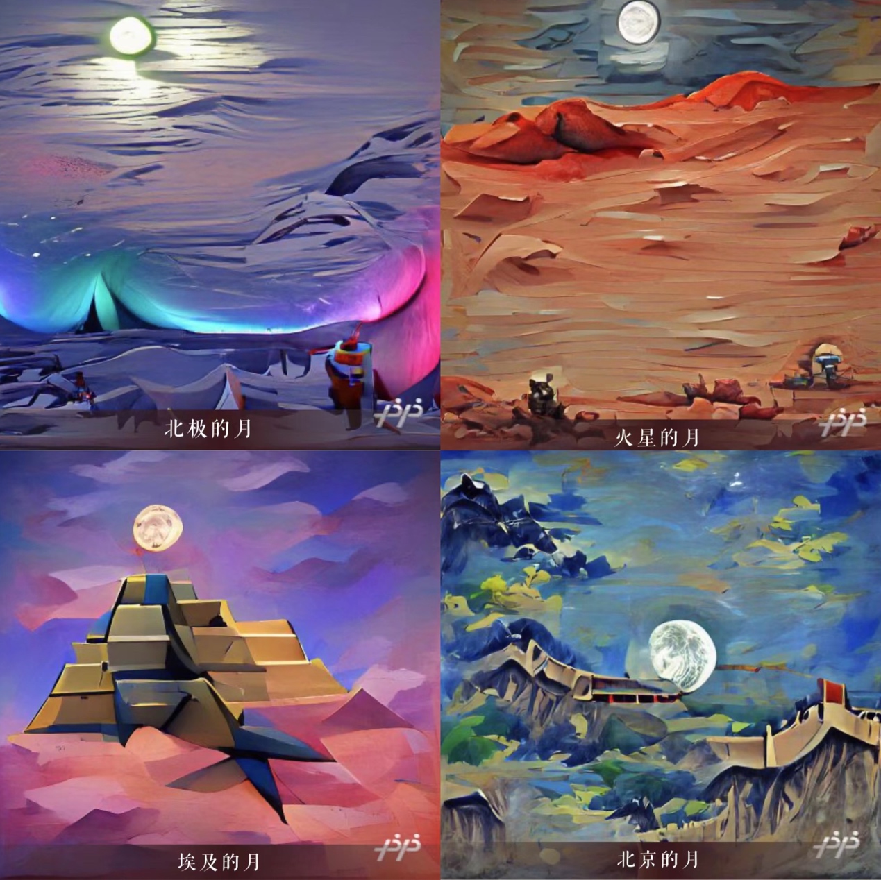 同イベントでは誰もがAI技術のサポートを受ければ、絵と文字による蕓術作品を制作できるようになっている。參加者が月を観賞するエリアを選ぶだけで、文心大模型がスピーディに理解し、創(chuàng)意あるアイデアを思いつく。習得した有名蕓術家の技法と畫風を活用し、テーマに合致した絵を描くことができる。例えば「北京」と入力すると、文心大模型は山々の中に連綿と続く長城の上に浮かぶ月を描く?!弗ē弗抓取工热肓Δ工毪?、エジプトの象徴であるピラミッドが見られ、さらには月の光を浴びる建築物という詩情あふれるシーンまで見せてくれる?!富鹦恰工热肓Δ工毪?、オレンジ色の火星の表面、隅の方で忙しく作業(yè)する火星探査車「祝融號」が目に入る。