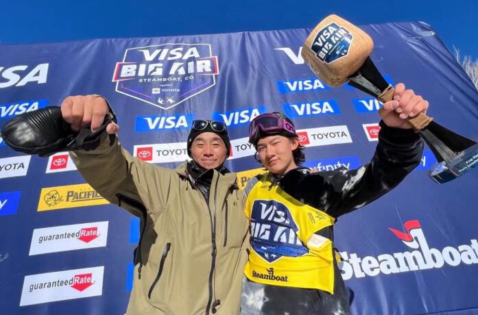 2021年12月5日、スノーボードW杯のビッグエアで優(yōu)勝後、佐藤コーチと肩を組む蘇翊鳴選手(取材対象者提供)。