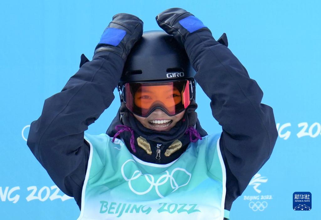 2022年2月15日、北京冬季五輪スノーボード女子ビッグエア決勝で競技する栄格選手(撮影?熊琦)。