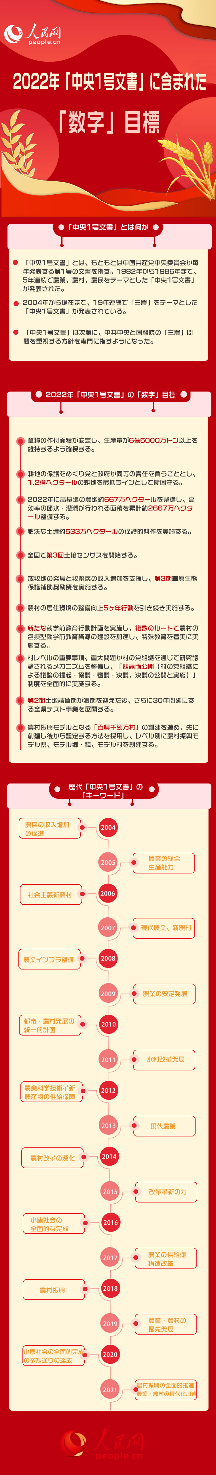 「2022年中央1號(hào)文書(shū)」である「2022年の農(nóng)村振興における重點(diǎn)活動(dòng)の全面的推進(jìn)の著実な実施に関する中共中央と國(guó)務(wù)院の意見(jiàn)」が22日に発表された。21世紀(jì)に入ってから19件目の「三農(nóng)(農(nóng)業(yè)?農(nóng)村?農(nóng)民)」をめぐる活動(dòng)を指導(dǎo)する中央1號(hào)文書(shū)となる。