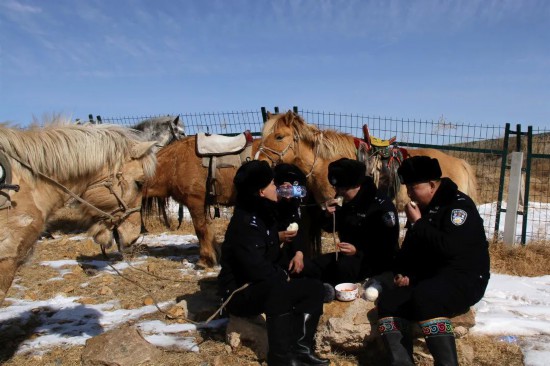 騎馬警官隊(duì)が草原鉄道をパトロールするようになって今年で10年目を迎えた。これまでの10年間、厳しい寒さの冬であっても、雪にも風(fēng)にも耐え、外で冷たい弁當(dāng)を食べ、馬に乗って鉄道の安全を守ると同時(shí)に、草原で暮らす牧畜民が安心して暮らすことができるようサポートしてきた。(編集KN)