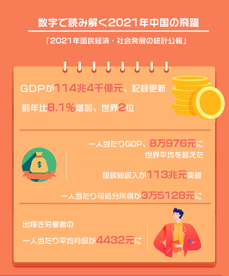 2021年は中國の國內(nèi)総生産(GDP)が前年比8.1%増加し、2年間の平均増加率は5.1%となり、世界の主要エコノミーの中でトップレベルだった。経済規(guī)模は110兆元(1元は約18.3円)を突破して114兆4千億元になり、世界2位をキープした。
