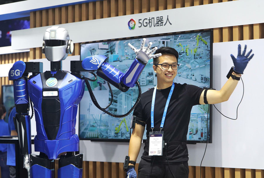 操作する人間の動(dòng)作とシンクロする5Gロボット(寫真著作権はCFP視覚中國(guó)が所有のため転載禁止)。